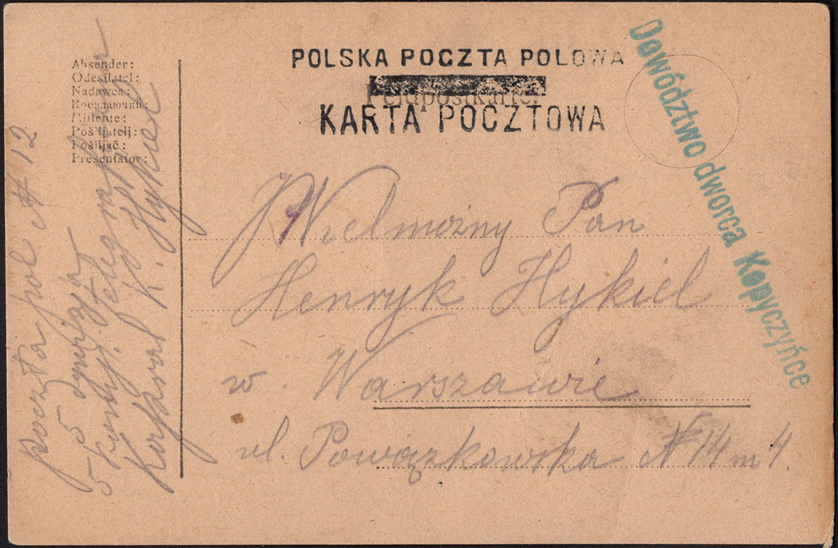 1919 kartka na formularzu poczty polowej z stemplem formacyjnym "Dowództwo dworca Kopyczyńce" do Warszawy, rzadko spotykany prowizoryczny formularz. | |