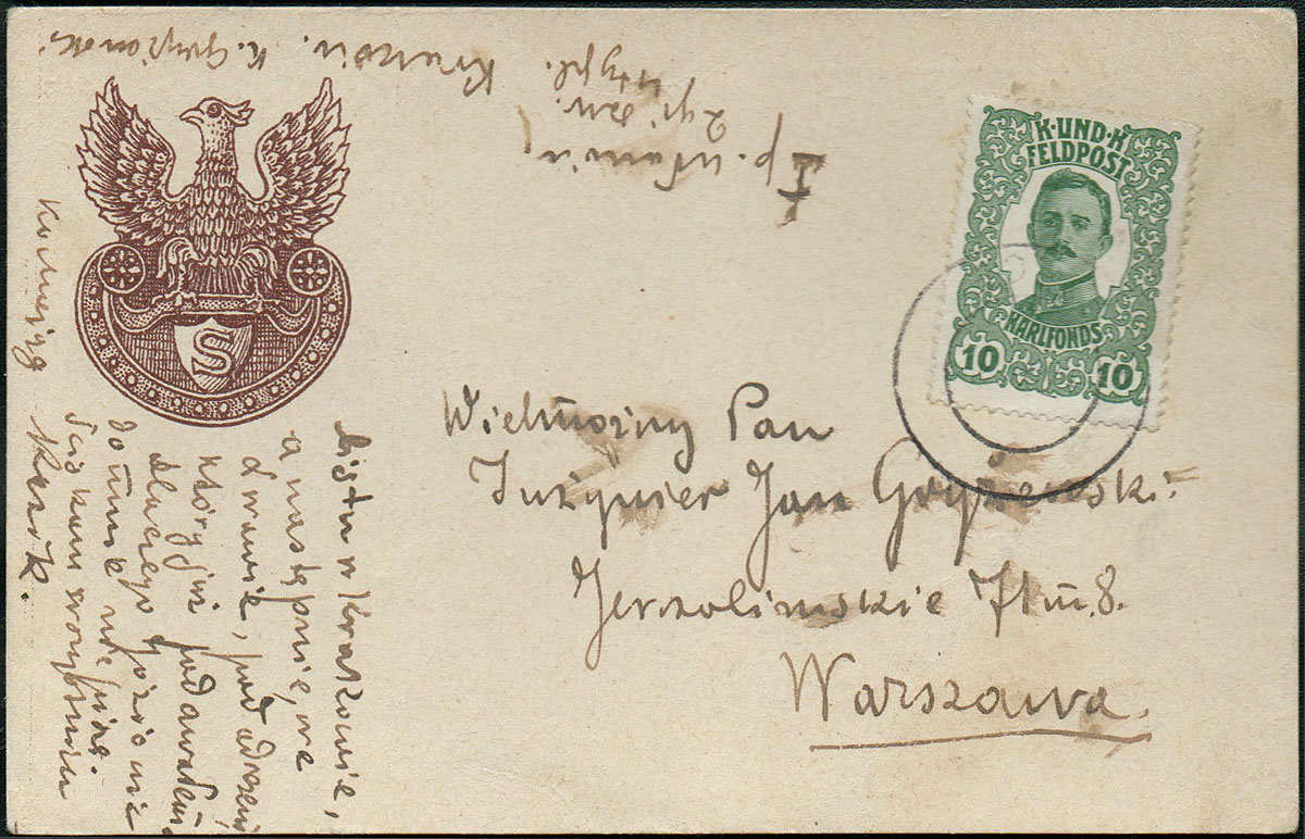 1919 kartka na formularzu poczty polowej z nadrukiem zakrywającym niemieckie napisy i orłem nadana z Wadowic do dowództwa frontu gen. Szeptyckiego. | |