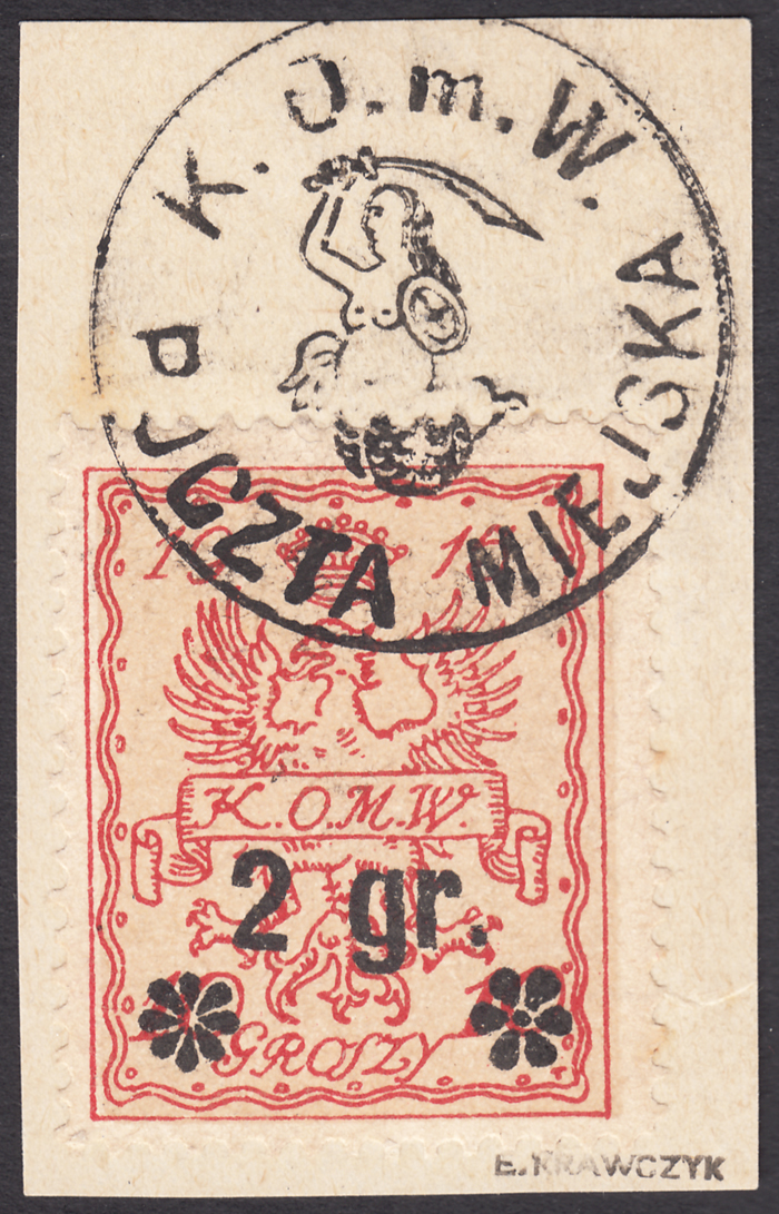 1916 Warszawa, wydanie z typograficznym nadrukiem nowej wartości, znaczek za 2/10 gr. z błędem na poz.28 w 1 sektorze "prawa gwiazdka 6-promienna" (Mi.200 euro), kasowany na wycinku, gwarancja Krawczyk. | Fi.9as Mi.9I |