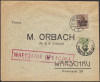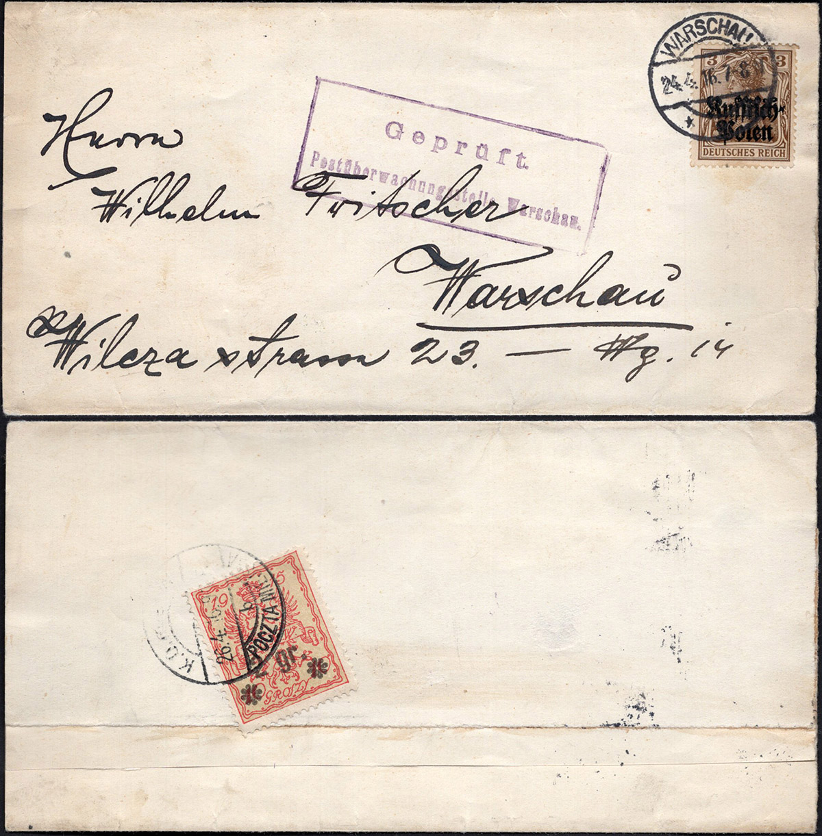 1916 Warszawa, list ekspresowy wysłany 26.07.16 z Norymberki do Warszawy ofrankowany znaczkami z dziurkowaniem firmowym "JK" ocenzurowany w tranzycie w Poznaniu, w Warszawie pobrano opłatę doręczeniową na odwrocie koperty znaczkami poczty miejskiej skasowanymi okrągłymi stemplami „K.O.m.W. POCZTA MIEJSKA”, w tym parka znaczków nieząbkowanych wydania przedrukowego z 1916 roku. | Fi.6, 7, 10nz |