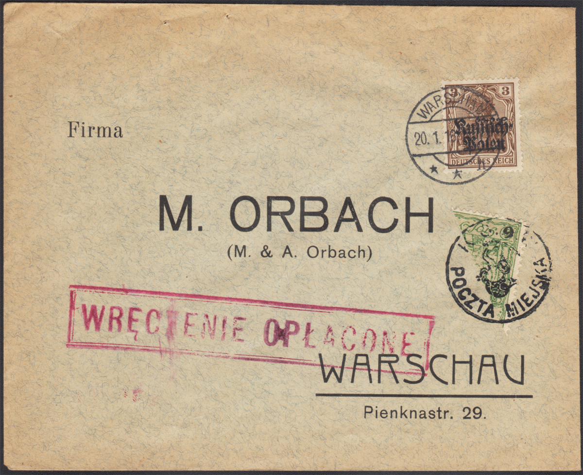 1916 Warszawa, miejscowy list opłacony jak druki wysłany 20.1, opłatę doręczeniową udokumentowano dzielonym znaczkiem poczty miejskiej za 6/5 gr skasowanym stemplem z syrenką, dodatkowo czerwony stempelek WRĘCZENIE OPŁACONE (98x17 mm - Fi.250.-) - całość inspirowana filatelistycznie; bardzo dobry stan zachowania | Fi.7; 27II |