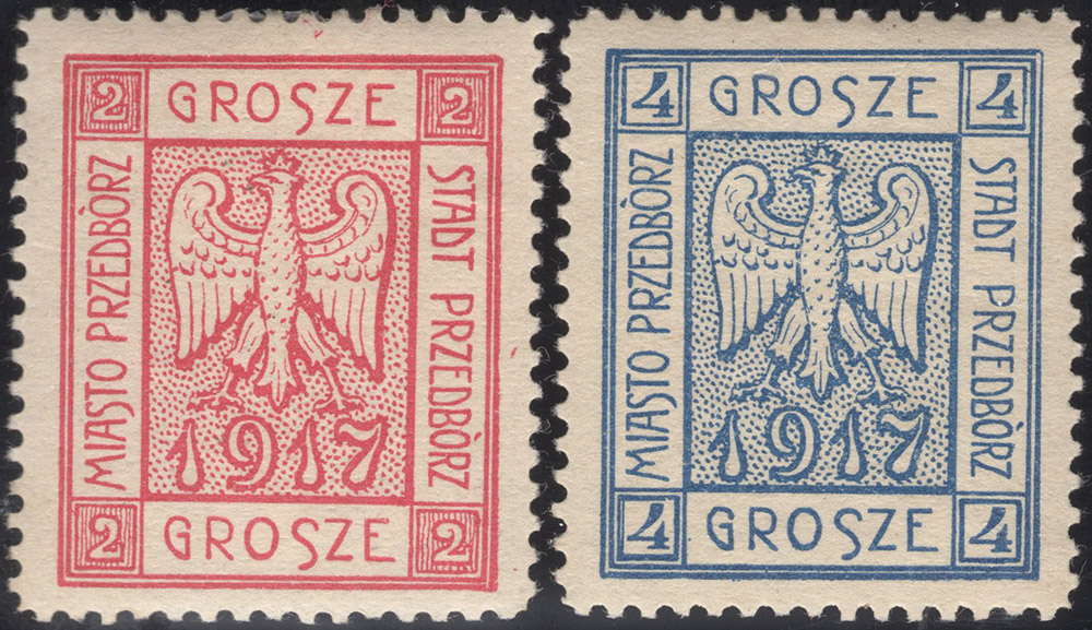 1917 Przedbórz, I wydanie, seria czysta (Fi.800.-), znaczek za 2 gr. - typ 7, sygnowany; znaczek za 4 gr. - typ 6, oba gwarancja z oznaczeniem typu. | Fi.1-2B Mi.1-2A |