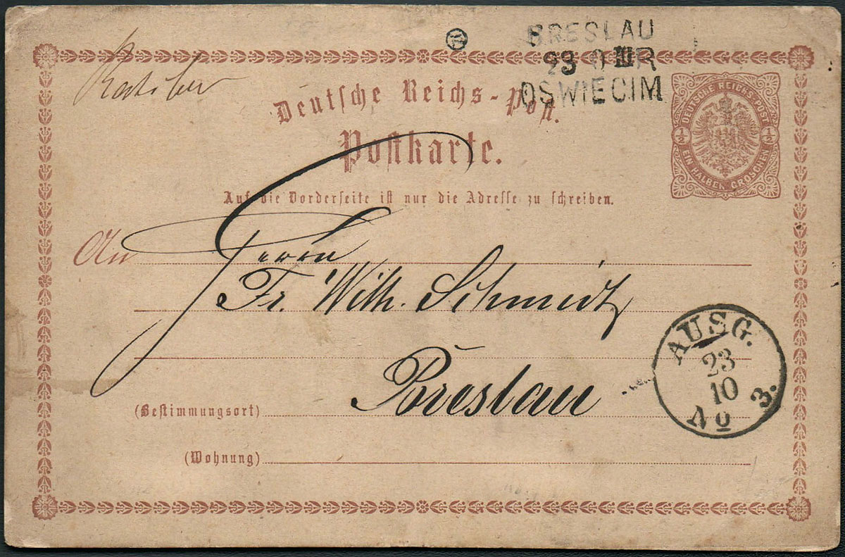 1874 niemiecka całostka nadana w Raciborzu (ręczny wpis Ratibor) do Wrocławia (Breslau) ze znakiem opłaty skasowanym 3-wierszowym stemplem ambulansu kolejowego "BRESLAU/23 10 III R/OSWIECIM", datownik odbiorczy. | Mi.P1 |