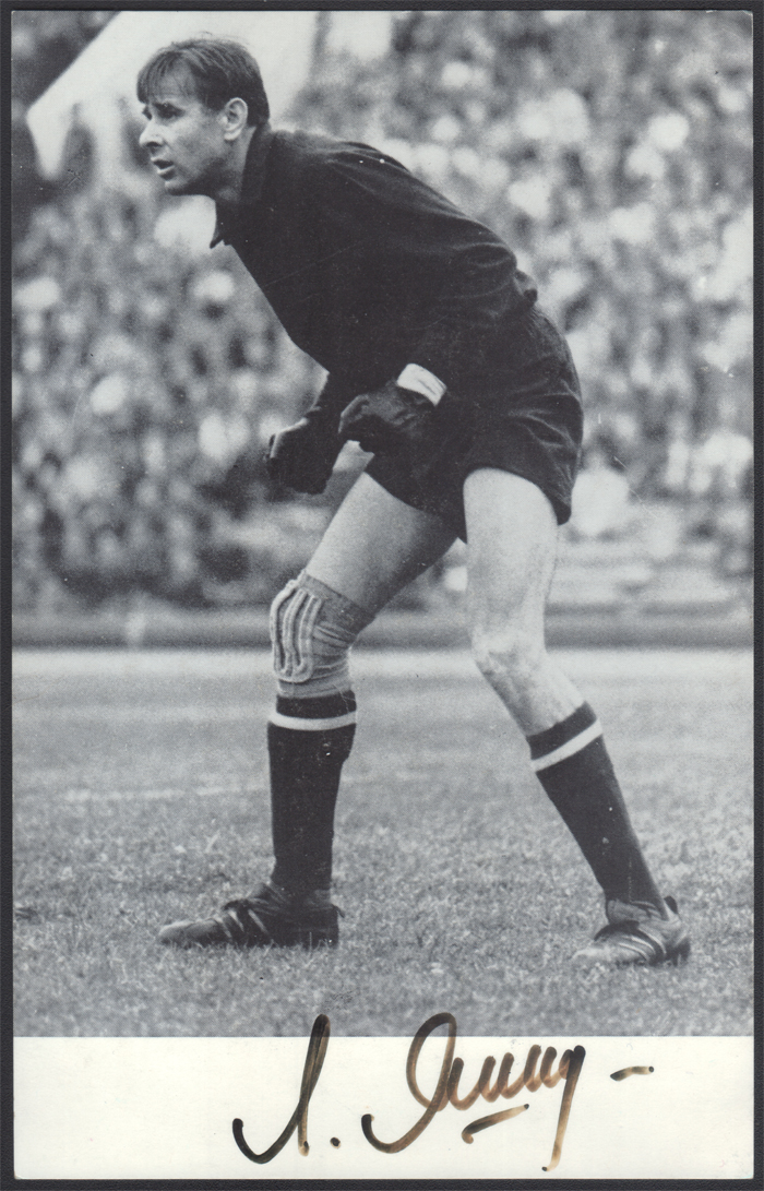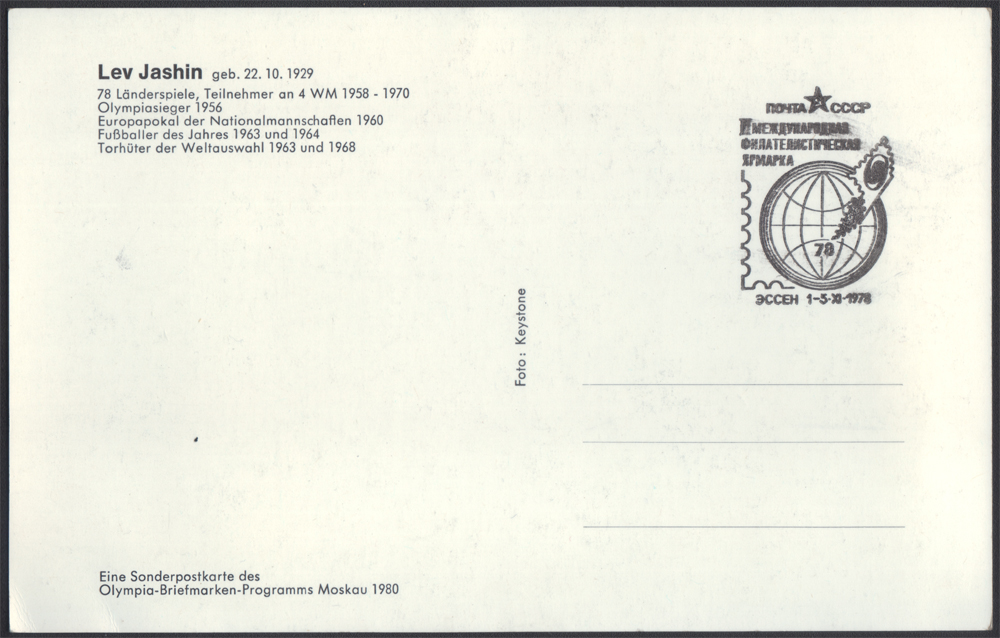 1978 Lew Jaszyn (1929-1990) - autograf legendarnego bramkarza reprezentacji ZSRR w piłce nożnej, uznawanego za najlepszego w historii futbolu, do dziś pozostaje jedynym bramkarzem, który otrzymał prestiżową nagrodę Złotej Piłki (1963), specjalna karta wydania pre-olimpijskiego Moskwa 1980, przygotowana na Międzynarodowe Targi Filatelistyczne w Essen w 1978 roku, na odwrocie stempel okolicznościowy; bardzo dobry stan zachowania; temat - SPORT, PIŁKA NOŻNA. | |