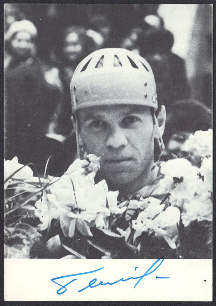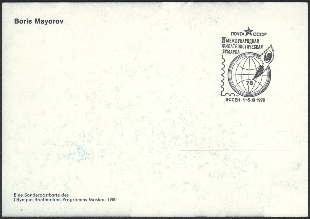 1978 Boris Majorow (ur.1938) - autograf napastnika reprezentanta ZSRR w hokeju na lodzie, kapitana reprezentacji, 2-krotnego złotego medalisty olimpijskiego (Innsbruck 1964, Grenoble 1968) i 6-krotnego mistrza świata w latach 1963–1968, specjalna karta wydania pre-olimpijskiego Moskwa 1980, przygotowana na Międzynarodowe Targi Filatelistyczne w Essen w 1978 roku, na odwrocie stempel okolicznościowy; bardzo dobry stan zachowania; temat - SPORT, HOKEJ NA LODZIE. | |
