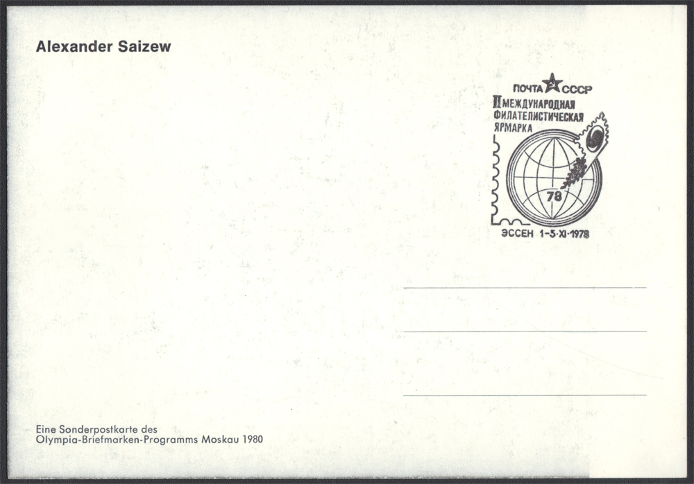 1978 Aleksander Zajcew (ur.1938) - autograf reprezentanta ZSRR w łyżwiarstwie figurowym, który w parze z Iriną Rodniną zdominował światowe areny w latach 70-tych, 2-krotny zdobywca złotego medalu olimpijskiego (Innsbruck 1976, Lake Placid 1980) 6-krotny mistrz świata (1973–1978) i 7-krotny mistrz Europy; podczas Mistrzostw Świata w 1973 w Bratysławie w trakcie ich występu nagle wyłączyła się muzyka, para nie przerwała programu i dokończyła go w całkowitej ciszy, wykonując wszystkie skomplikowane elementy przy aplauzie publiczności, zdobyli wtedy swój pierwszy wspólny tytuł mistrzów świata; specjalna karta wydania pre-olimpijskiego Moskwa 1980, przygotowana na Międzynarodowe Targi Filatelistyczne w Essen w 1978 roku, na odwrocie stempel okolicznościowy; bardzo dobry stan zachowania; temat - SPORT, ŁYŻWIARSTWO FIGUROWE. | |