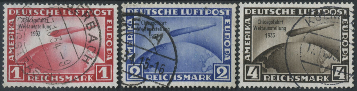 1933 lot sterowca Zepelin na Wystawę Światową w Chicago, seria stemplowana, pierwszy znaczek z mini atestem Schlegel. | Mi.496-8 |