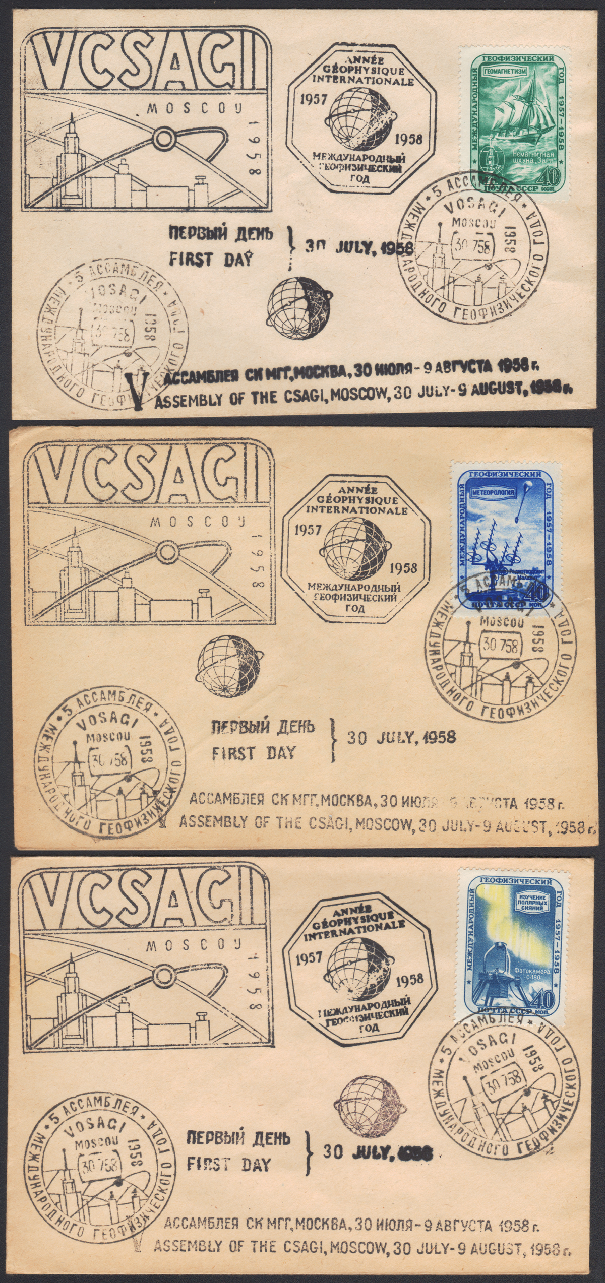 1958 ZSRR, Międzynarodowy Rok Geofizyczny, seria znaczków na specjalnych kopertach ze stemplami okolicznościowymi z okazji V Zgromadzenia CSAGI (Comité Spécial de l'Année Géophysique Internationale) Specjalnego Komitetu ds. Międzynarodowego Roku Geofizycznego (1957–1958). | Mi.2103-5A |