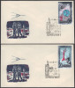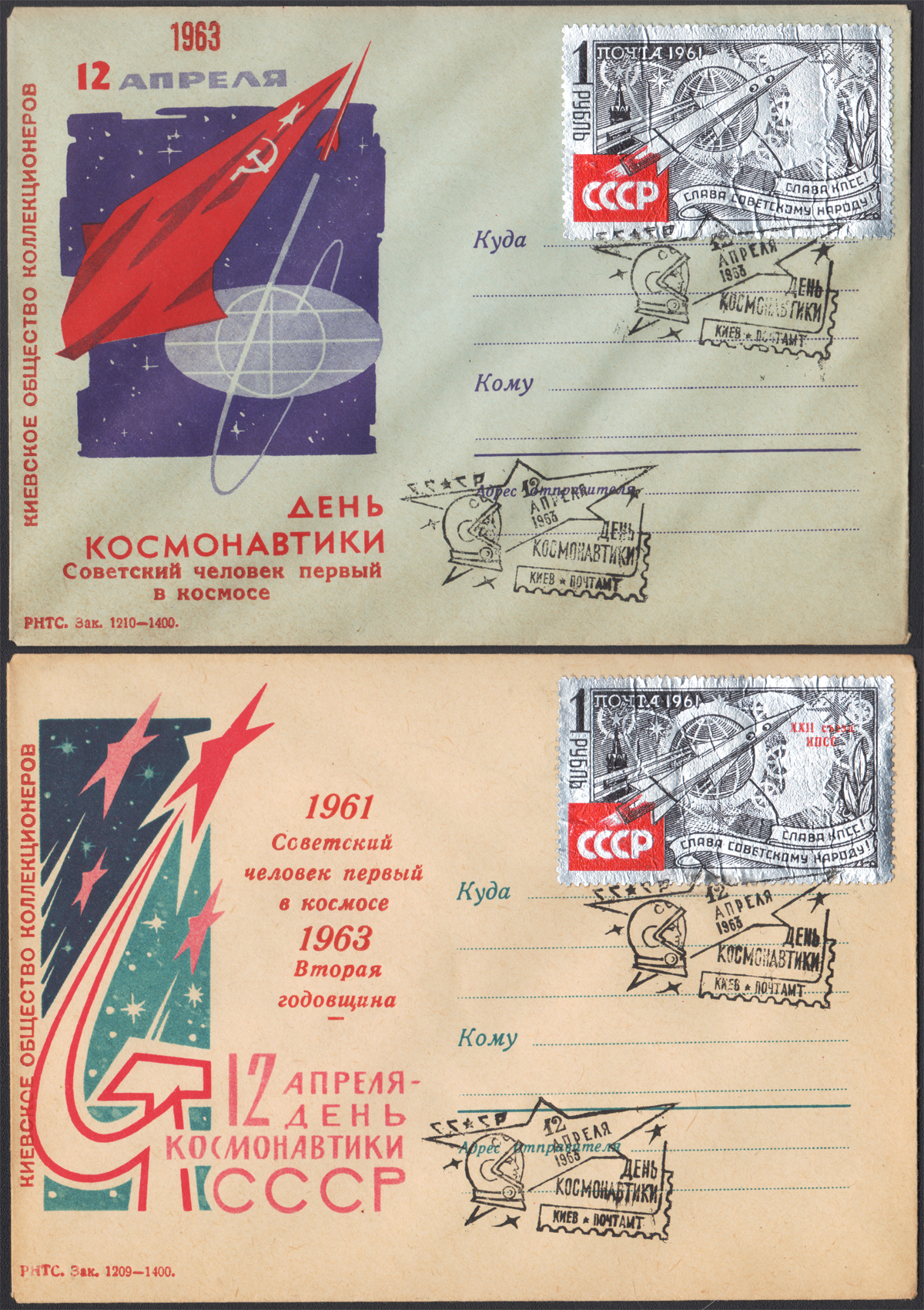 1961 ZSRR, XXII Zjazd KPZR (II+III), znaczki wydane na folii aluminiowej, bez przedruku i z przedrukiem długości 11,2 mm, skasowane na kopertach 12.IV.1963 stemplem okolicznościowym z okazji Dnia Kosmonautyki; bardzo dobry stan zachowania. | Mi.2540, 2541II |