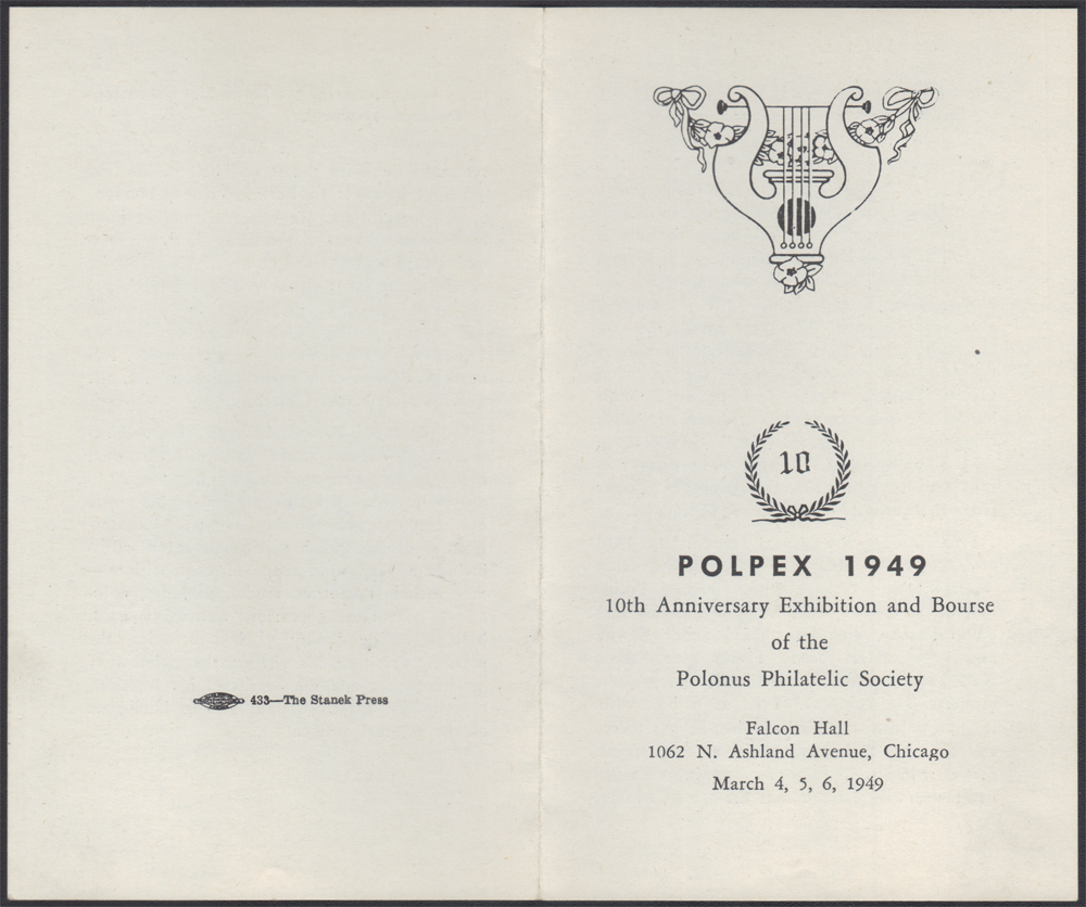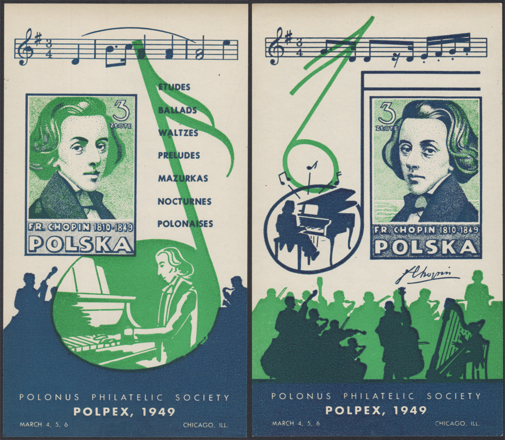 1949 "POLPEX 1949" dwie pamiątkowe winiety w formie bloczków (z broszurką) wydane staraniem Polonus Philatelic Society w Chicago; poświęcone Fryderykowi Chopinowi; bardzo dobry stan zachowania. | |