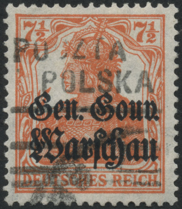 1918 Ciechocinek, kasowany znaczek okupacji niemieckiej - "Gen.-Gouv. Warschau" za 7,5 fen. z unikalnym lokalnym nadrukiem, według Włodzimierza Rachmanowa (cytat): to najrzadsze wydanie lokalne z tego okresu, znane z kilku lub nawet w pojedynczych egzemplarzach każdej wartości, przedrukowano je gumowym stempelkiem "PoczTa poLska" złożonym z pojedynczych liter i wobec braku odpowiednich małych użyto również w środku litery duże; nadruk jest czysto fioletowy, przeważnie dość słabo odbity; odkryte zostały stosunkowo późno, bo pierwszy znaczek wartości 10 fen., który zobaczyłem dostałem od mego przyjaciela p.Kazimierza Gryżewskiego dopiero w roku 1927; znaczek ten p.K.Gr. znalazł w masówce..;.. dzięki temu, że wydanie to było ukryte prawie 10 lat przed zbieraczami i handlarzami, nie zdołano zrobić "drugich wydań" lub nowodruków, dzięki czemu wydanie to, jak już zaznaczyłem, uważam za najbardziej solidne i rzadkie ze wszystkich wydań lokalnych PP na GGW;, bardzo ciekawy egzemplarz, po prawej litera P z nadruku na sąsiednim znaczku, poza resztkami przebarwionej gumy zachowany w pięknym stanie; super pochodzenie - sygnowany ENGL (Englert Zygmunt - najstarsza firma filatelistyczna w Polsce) i splecione WR (W.Rachmanow), gwarancja Schmutz.