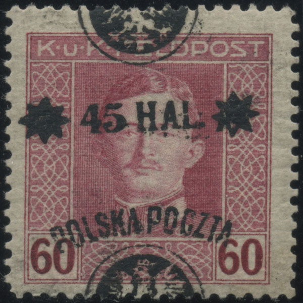 1918 drugie wydanie lubelskie, znaczek za 45/80 hal. z nadrukiem odwróconym - typ z beleczkami zasłaniajacymi stary nominał (Fi.450.-), ładny stan, przedwojenne sygnatury, gwarancja Mikstein, Schmutz. | Fi.25a No Mi.25I |