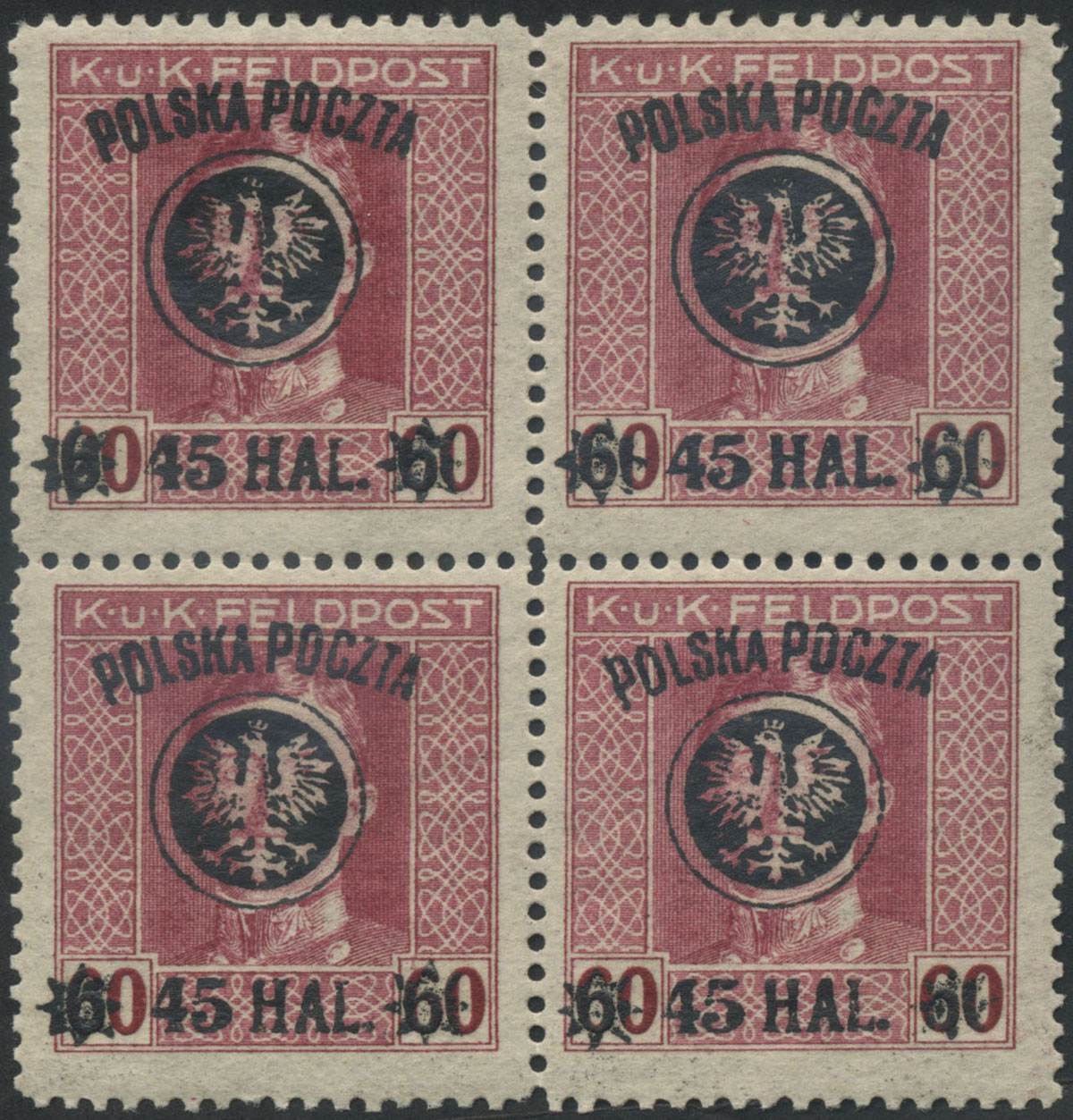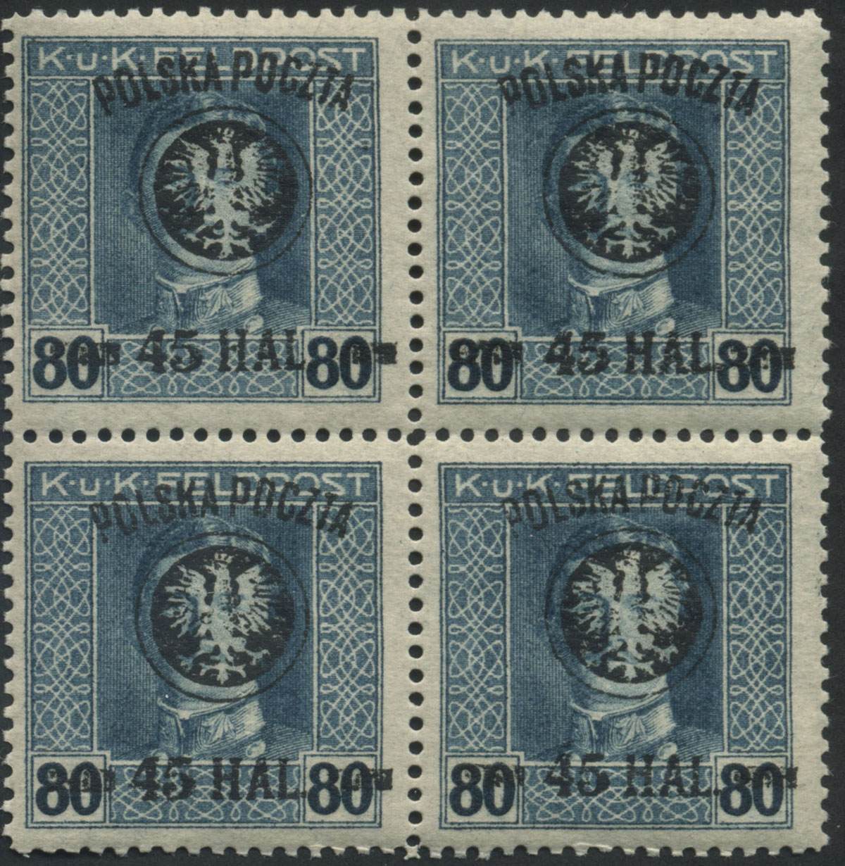 1918 drugie wydanie lubelskie, czworoblok z nadrukami w barwie niebieskoczarnej, prawe znaczki z błędami "brak liter TA i ZTA", gwarancja i opis Schmutz. | Fi.25b B9+B10 Mi.25I |