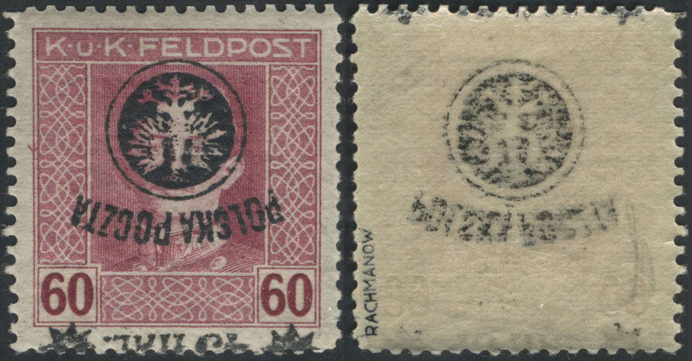 1918 drugie wydanie lubelskie, znaczek z przesuniętym nadrukiem odwróconym i abklaczem, gwarancja Rachmanow. | Fi.24No Mi.24K |