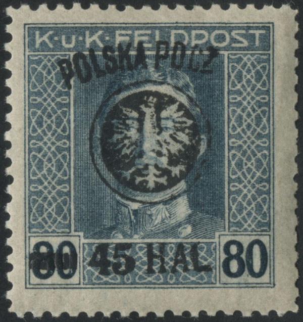 1918 drugie wydanie lubelskie, znaczek za 45/80 hal. z nadrukiem w kolorze niebieskoczarnym, z błędem na poz.40 "brak TA i prawej kreski" (Fi.540.-), gwarancja Łaszkiewicz, z opisem Schmutz. | Fi.25b B10 Mi.25I |