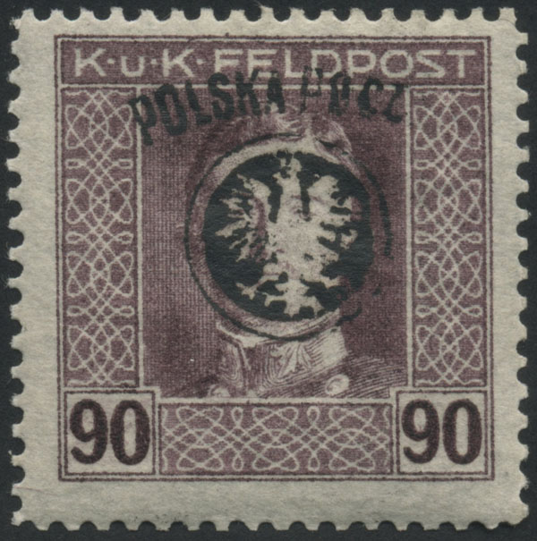 1918 drugie wydanie lubelskie, znaczek z silnie przesuniętym nadrukiem, gwarancja Jendroszek. | Fi.29MK Mi.28 |