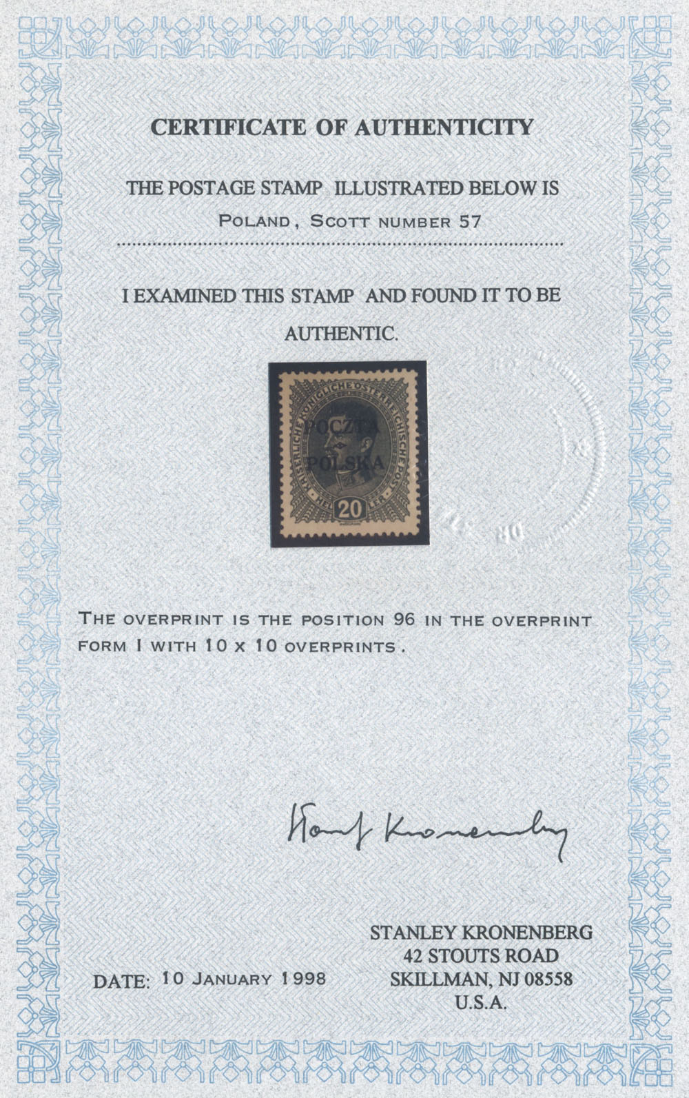 1919 wydanie krakowskie, znaczek z nadrukiem pierwszej formy z poz. 96, ślad po podlepce, gwarancja Mikulski, fotoatest Kronenberg. | Fi.36 Mi.35 |