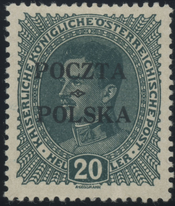 1919 wydanie krakowskie, znaczek za 20 h. z podniesionym w górę nadrukiem pierwszą formą z usterką na poz. 47 "uszkodzone P w POLSKA", gwarancja i oznaczenie Łaszkiewicz. | Fi.36 Mi.35 |