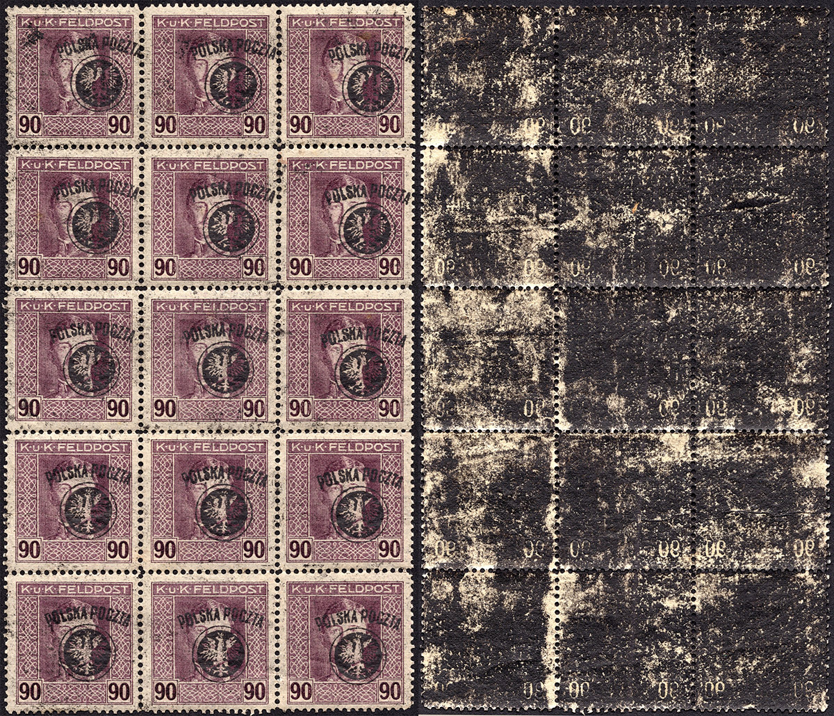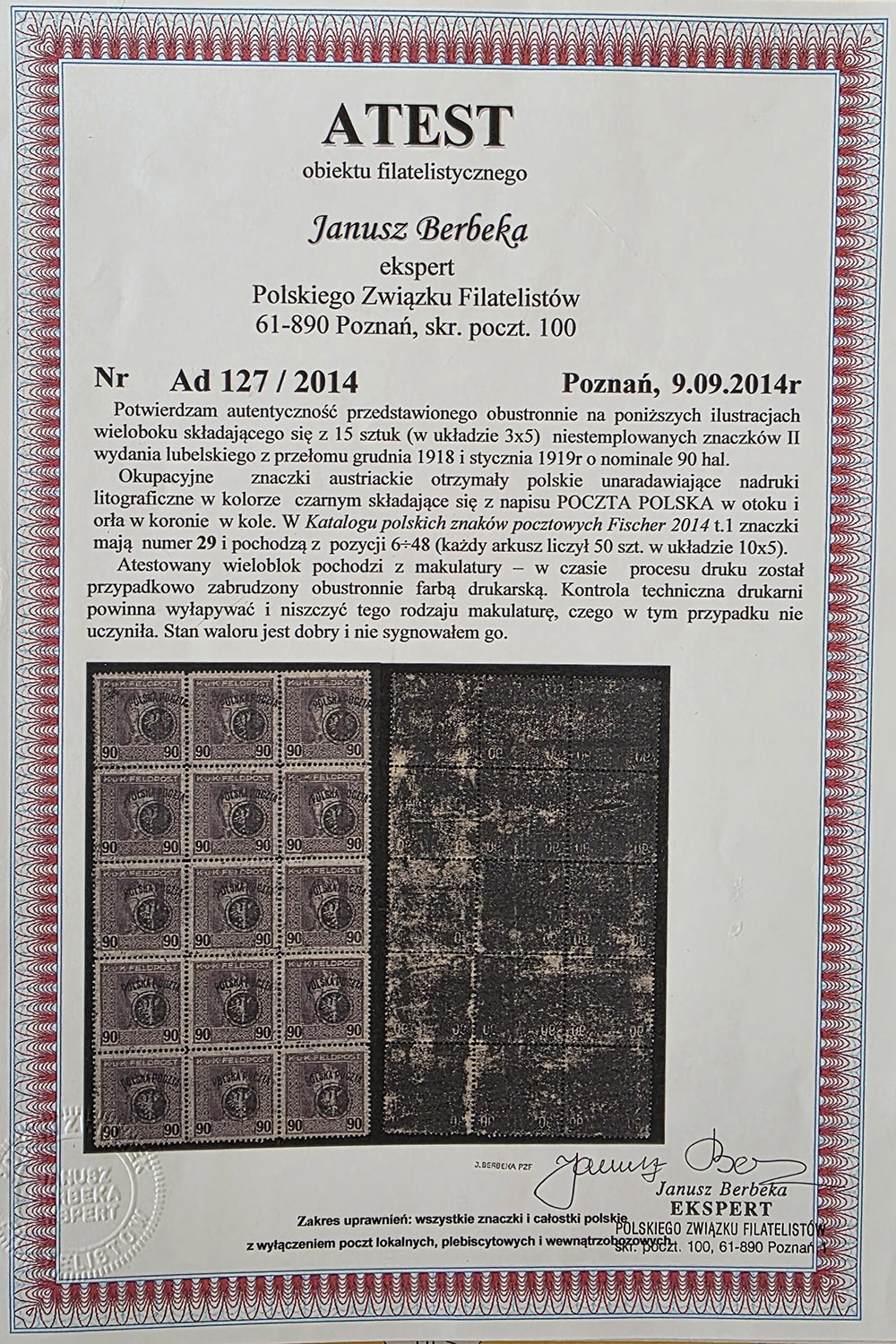 1918 drugie wydanie lubelskie, makulaturowy piętnastoblok zabrudzony obustronnie farbą drukarską, fotatest Berbeka. | Fi.29MK Mi.28 |