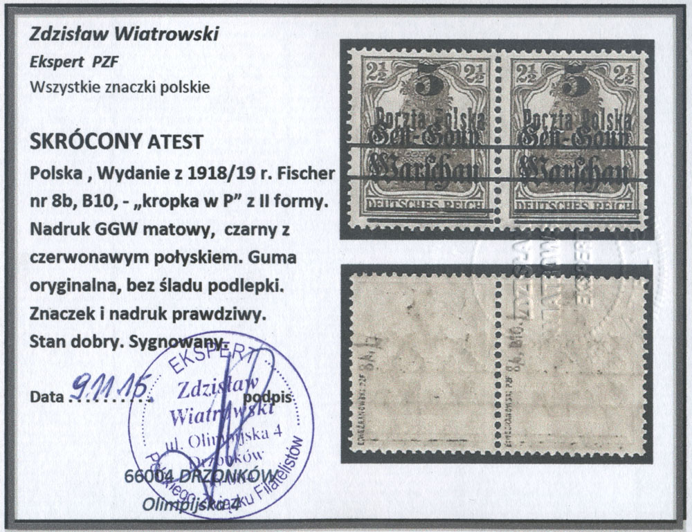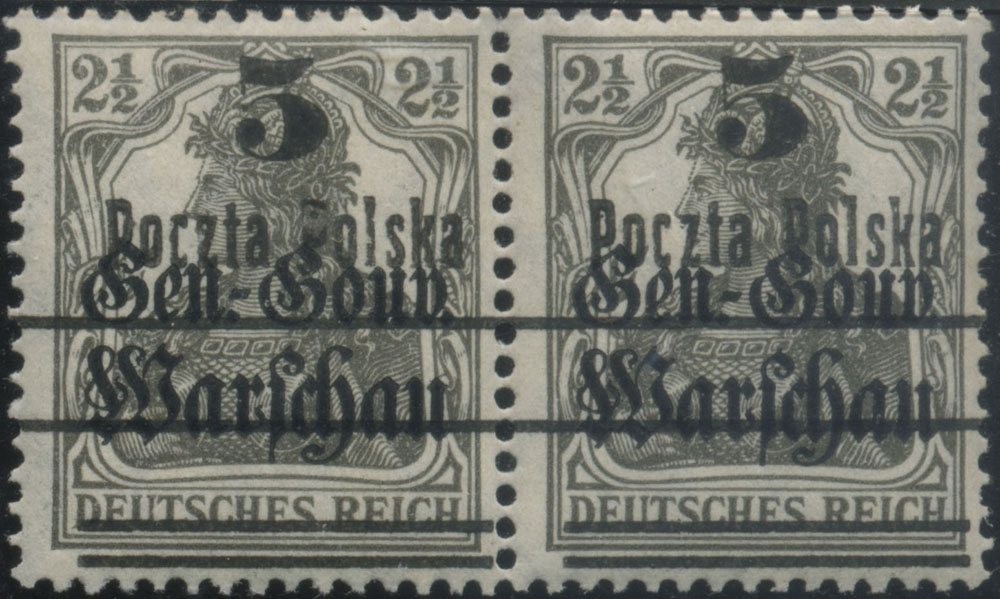 1918 wydanie PP/GGW, parka znaczków z przesuniętym nadrukiem pierwszej formy, gwarancja i oznaczenie. | Fi.8aI MK Mi.14I |