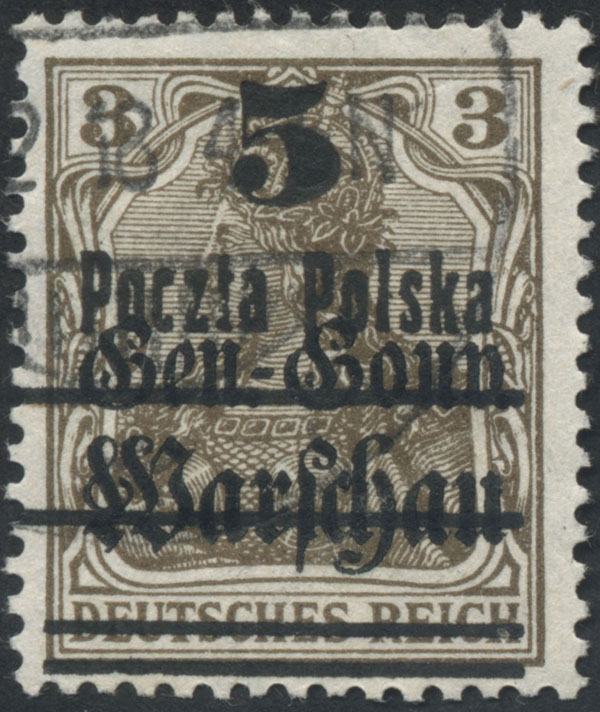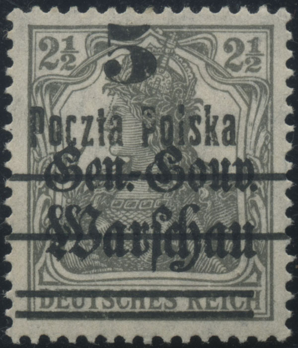 1918 wydanie PP/GGW, znaczek z nadrukiem II formy, nadruk GGW farbą anilinową, gwarancja i oznaczenie. | Fi.9aII Mi.15II |