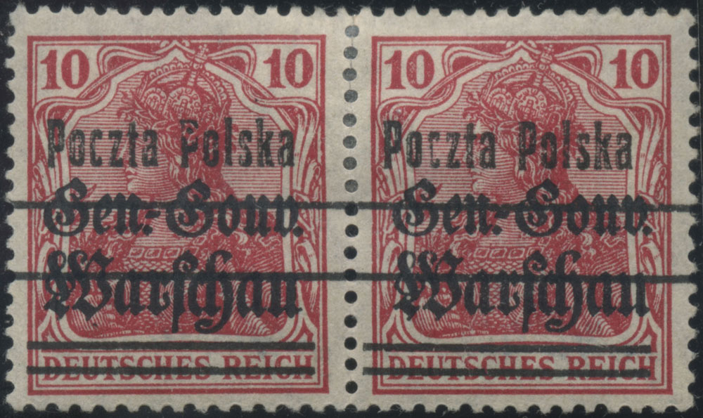 1918 wydanie PP/GGW, parka znaczków z przesuniętym nadrukiem pierwszej formy, prawy dolny znaczek z błędem "kropka w k", gwarancja i oznaczenie Berbeka. | Fi.9bIB16 Mi.15I |