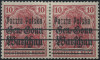 1918 wydanie PP/GGW, marginesowy czworoblok znaczków za 10 fen. z nadrukiem drugą formą z dwoma błędami: na lewym górnym znaczku opisany przez L.Schmutza i K.Sztabę błąd z poz.39 "uszkodzone P i l", na dolnym katalogowany błąd z poz.49 "odwrócone k" (Fi.400.-), gwarancja i opis obu błędów Schmutz. | Fi.10cII B+B7 Mi.8II |
