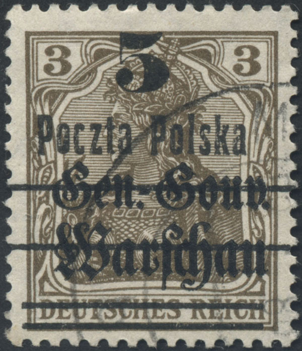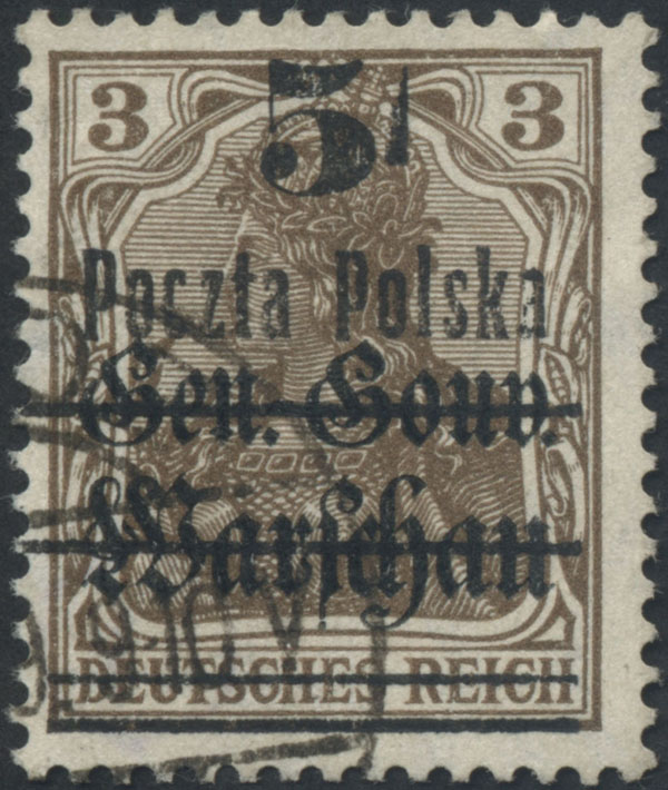 1918 wydanie PP/GGW, znaczek z silnie przesuniętym i lekko ukośnym nadrukiem pierwszej formy, gwarancja i oznaczenie. | Fi.9bIMK Mi.15I |