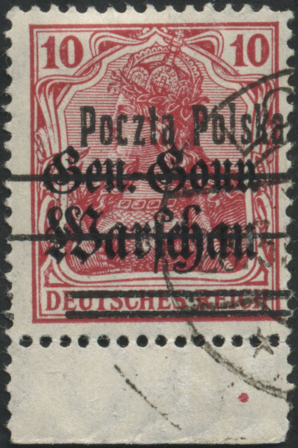 1918 wydanie PP/GGW, znaczek za 10 fen. z nadrukiem drugą formą z opisanym ostatnio przez L.Schmutza i K.Sztabę błędem na poz.51 "piąta kreska", rzadki błąd występujący tylko w części nakładu i do tej pory na tym nominale nieznany, gwarancja i opis. | Fi.10cII B Mi.8II |