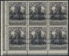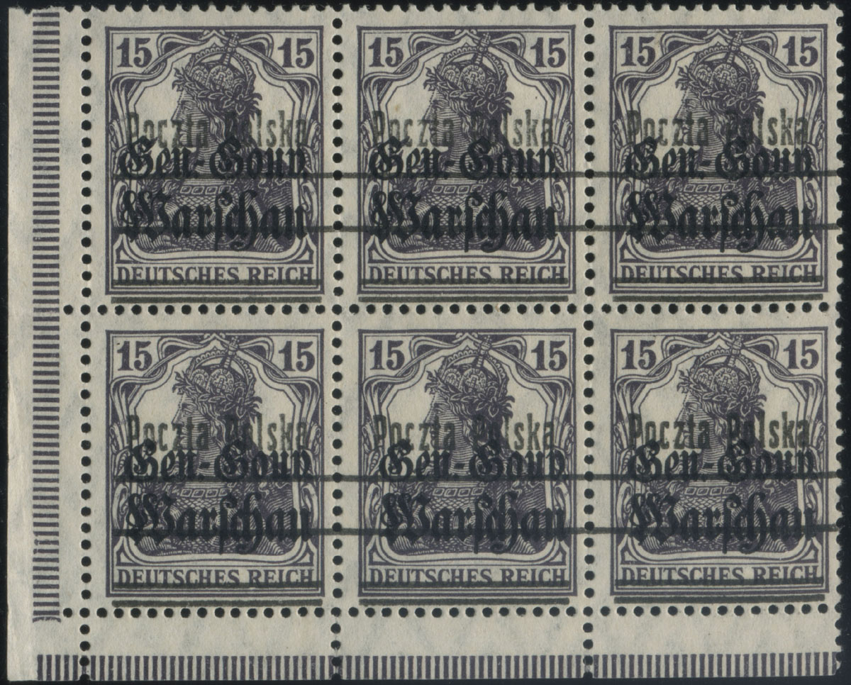 1918 wydanie PP/GGW, sześcioblok z nadrukiem drugiej formy, górny lewy znaczek z błędem "kropka w P w wyrazie Polska", gwarancja i oznaczenie Berbeka. | Fi.11II B10 Mi.9II |
