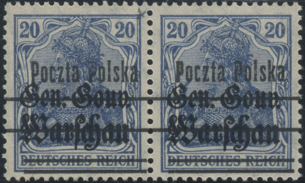 1918 wydanie PP/GGW, parka znaczków za 20 fen. w kolorze szafirowym, z bardzo rzadkim w tym kolorze nadrukiem pierwszą formą, prawy z błędem z poz.57 "kropka w P" (Fi.14400.-), niska cena wywoławcza, gwarancja i opis Schmutz. | Fi.12bbI B5 Mi.10Ib |