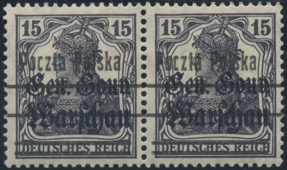 1918 wydanie PP/GGW, parka znaczków za 15 fen. z nadrukiem drugiej formy, lewy znaczek z błędem na poz.49 "odwrócone k" (Fi.250.-), piękny stan zachowania, gwarancja i oznaczenie. | Fi.11cII B7 Mi.9II |