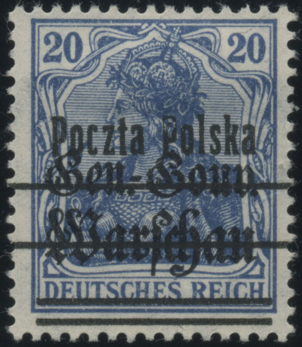 1918 wydanie PP/GGW, znaczek w barwie szafirowej z nadrukiem pierwszej formy z błędem "Pocata", gwarancja Miszczak, Mikstein, i z oznaczeniem Wiatrowski. | Fi.12bbIB1 Mi.10bI |