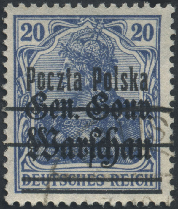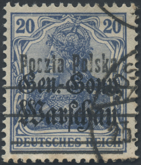 1918 wydanie PP/GGW, znaczek za 20 fen. w kolorze jasnoniebieskim na papierze szarawym, z nadrukiem drugą formą z dokładnie opisanym ostatnio przez L.Schmutza i K.Sztabę błędem na poz.79 "ścienione c" (inne błędy Fi.130.-), ładny stan zachowania, gwarancja i oznaczenie. | Fi.12cyII B Mi.10cII |