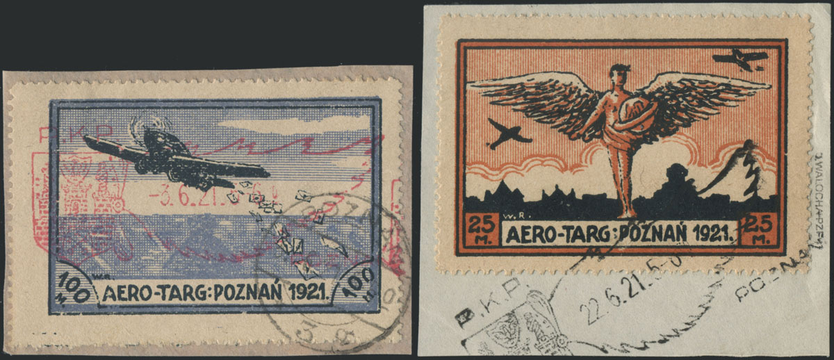 1921 T.A.B.R.O.M.I.K. - wydanie współpocztowe znaczków dodatkowej obowiązkowej opłaty lotniczej, seria kasowana na wycinkach - jeden kasownik w kolorze czerwonym, drugi w czarnym, gwarancja. | Fi.L1-2 Mi.I-II |