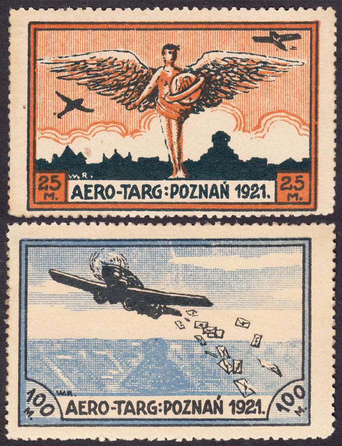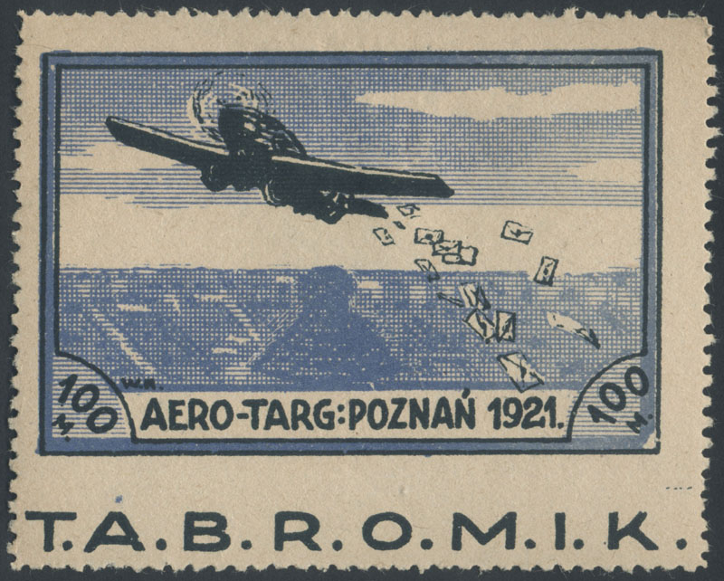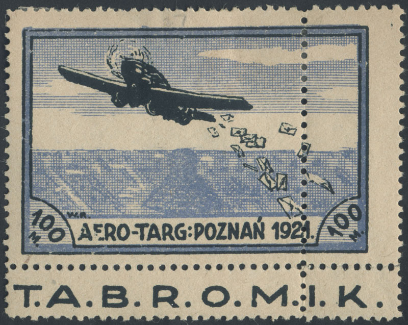 1921 T.A.B.R.O.M.I.K. - wydanie współpocztowe; znaczek dodatkowej, obowiązkowej opłaty lotniczej za 100 mk. BEZ PERFORACJI POZIOMEJ U DOŁU (Fi.500.-), na poleconym liście lotniczym, wysłanym 1.6 z Poznania do Warszawy; znaczek unieważniony kasownikiem "skrzydło" w kolorze czarnym, na odwrocie okrągły kasownik odbiorczy Warszawa z 3.6; według opisu eksperta PZF A.Kłosińskiego w artykule w Filateliście nr.2/1992:"Listy i kartki pocztowe zgodnie z umową pomiędzy PKP "Aero-Targ" a Ministerstwem Poczt i Telekomunikacji, musiały posiadać frankaturę właściwą dla pośpiesznego doręczenia (express), czyli np. dla ... listu poleconego - 20 mk. oraz dodatkową opłatę lotniczą znaczkami "Aero-Targu"" znaczek opłaty lotniczej za 100 mk. używany na korespondencji o wadze ponad 20 gram lub poleconej jest rzadko spotykany - tu dodatkowo z błędem perforacji, walor w dobrym stanie zachowania; gwarancja Krawczyk. | Fi.L2 MK1, 101 Mi.II, 117 |