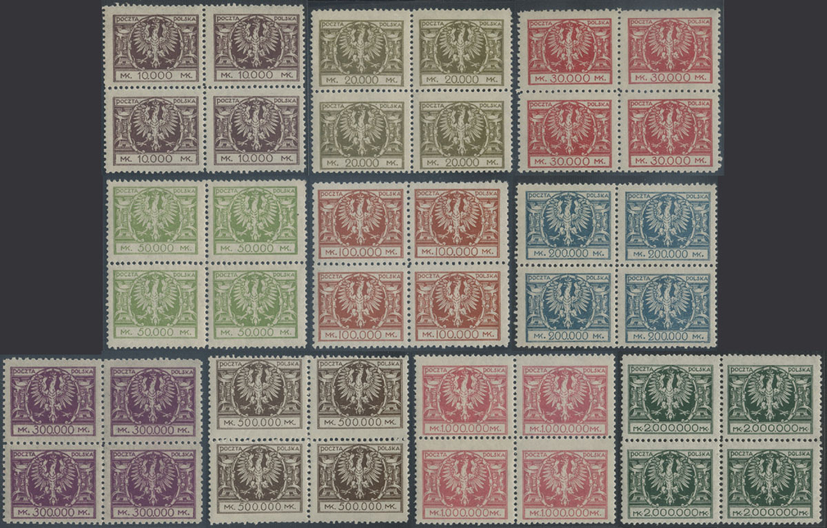 1924 duży orzeł na tarczy barokowej, seria w czworoblokach. | Fi.172-81 Mi.191-200 |