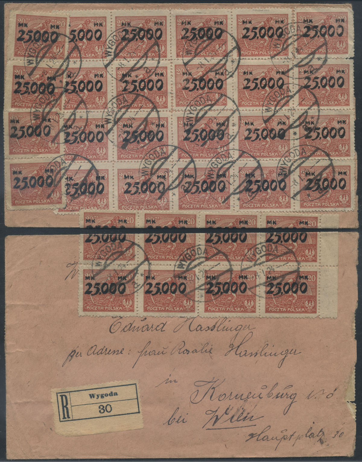 1924 hiperinflacja, list polecony z Wygody nadany 8.01.24 do Wiednia, opłata w wysokości 80.00 mk 32 znaczkami wydania przedrukowego. | Fi.169II |