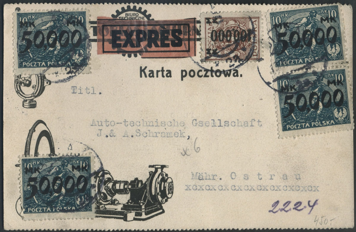 1924 hiperinflacja, unikalna odwrotka nadruku 25.000/20 mk na liście z Rawicza nadanym 16.01.24 do Niemiec, wysoka opłata zgodna z taryfą pocztową w wysokości 600.000 mk; 6 znaczków z przedrukiem 50.000 mk i 12 znaczków z przedrukiem 25.000 mk, w tym jeden z odwróconym nadrukiem. | Fi.169IINo, 169, 170 Mi.187K, 187, 188 |