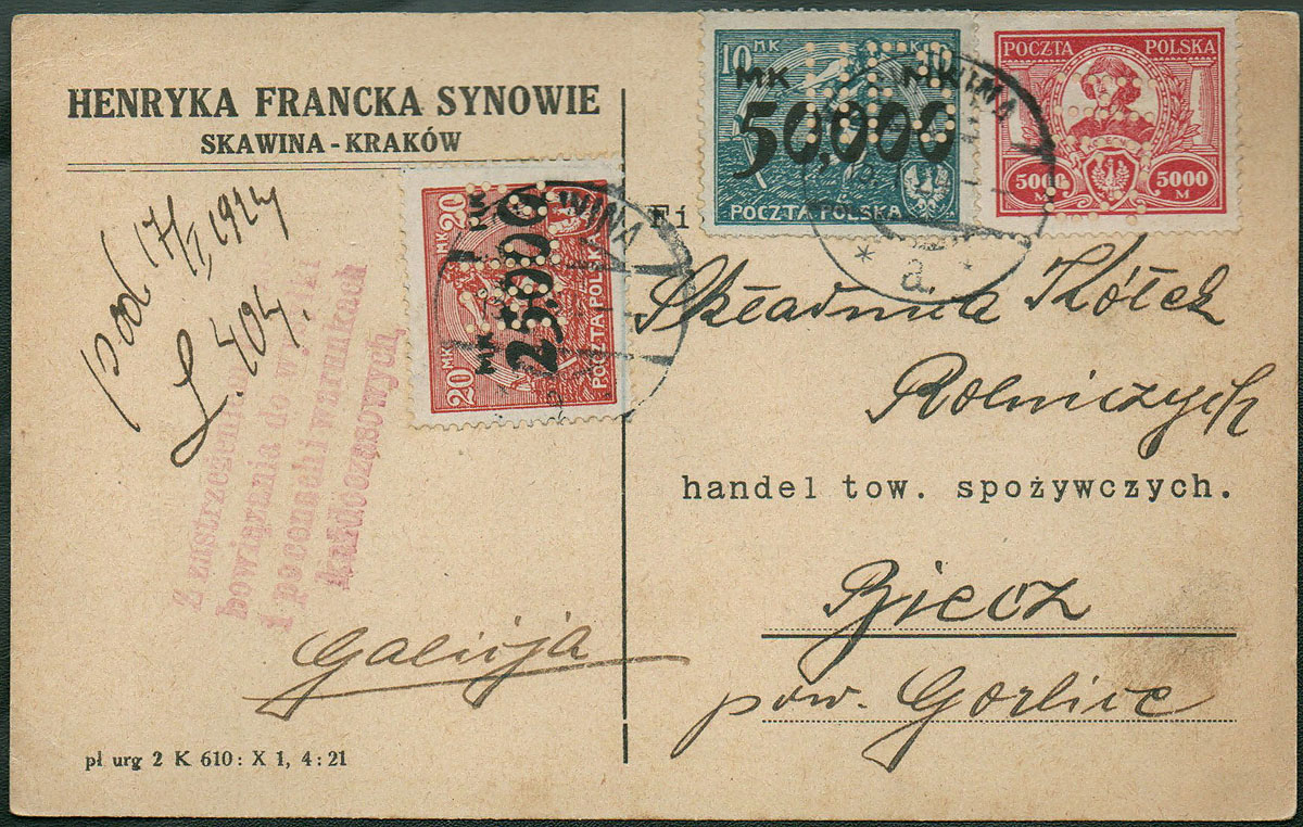 1924 kartka firmowa wysłana Skawiny do Biecza opłacona znaczkami z perforacją firmową "HFS" - Henryka Francka Synowie w Skawinie, dekoracyjny i rzadki walor. | Fi.166, 169II, 170 |