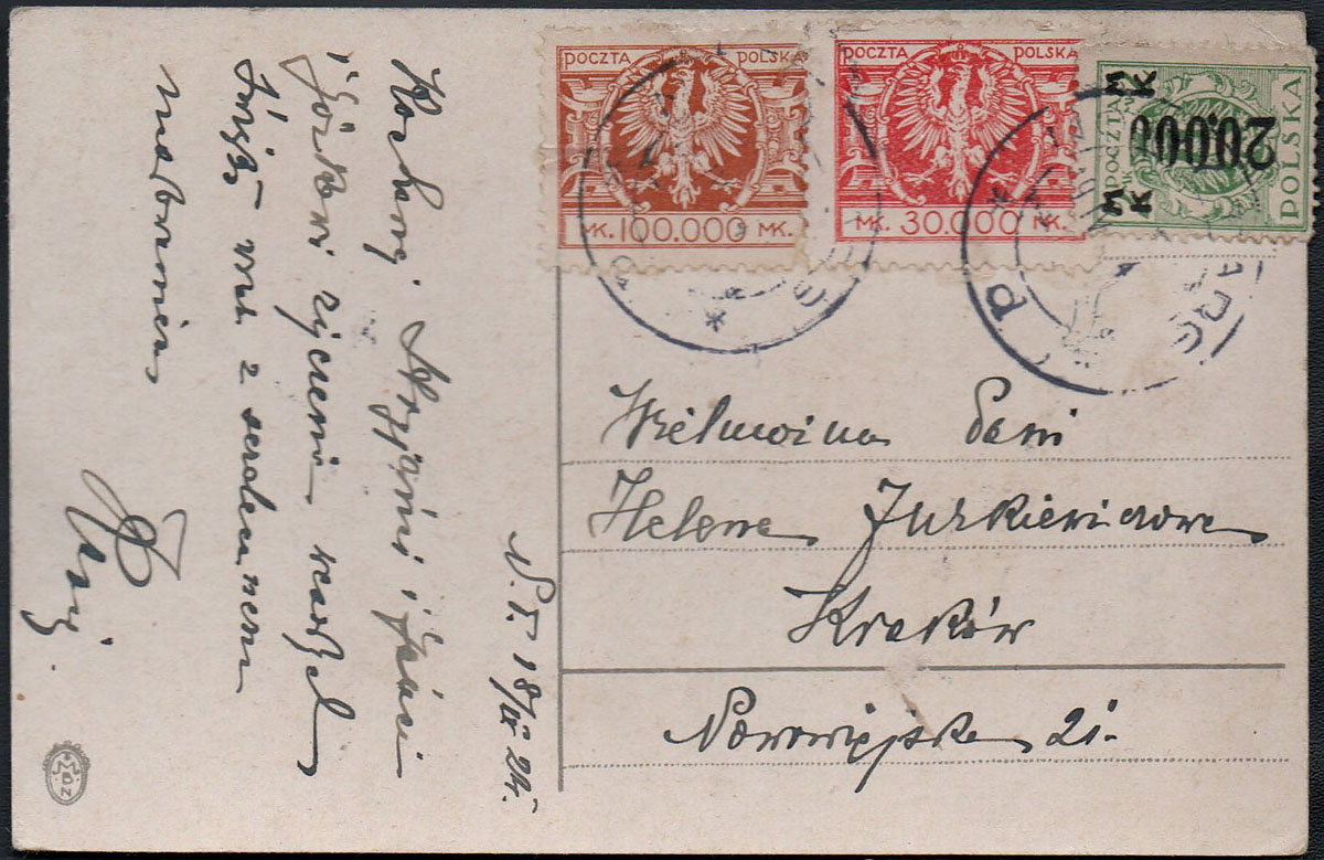 1924 hiperinflacja, kartka z Nowego Targu nadana 19.04.24 do Krakowa, znaczek za 20.000 mk. z usterką niedobitego druku. | Fi.168, 174, 176 |