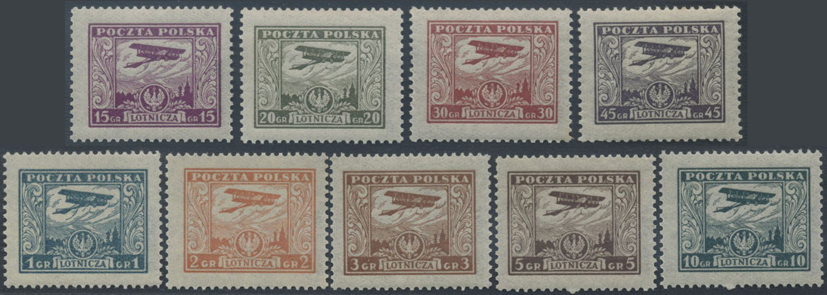 1925 wydanie na przesyłki lotnicze, kompletna seria na liście lotniczym z Warszawy do Paryża, dofrankowano znaczkiem za 50 gr "Orzeł w wieńcu", znaczki skasowane 11 IX w urzędzie Warszawa 1, stempelek gotówkowej dopłaty za przesyłkę lotniczą z wpisaną liczbą "30", dodatkowe stempelki "SAMOLOTEM" i "Par avion"; dekoracyjny walor w bardzo dobrym stanie zachowania. | Fi.216-24 Mi.224-32 |