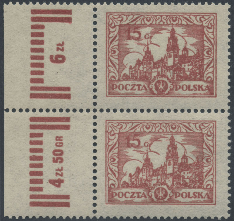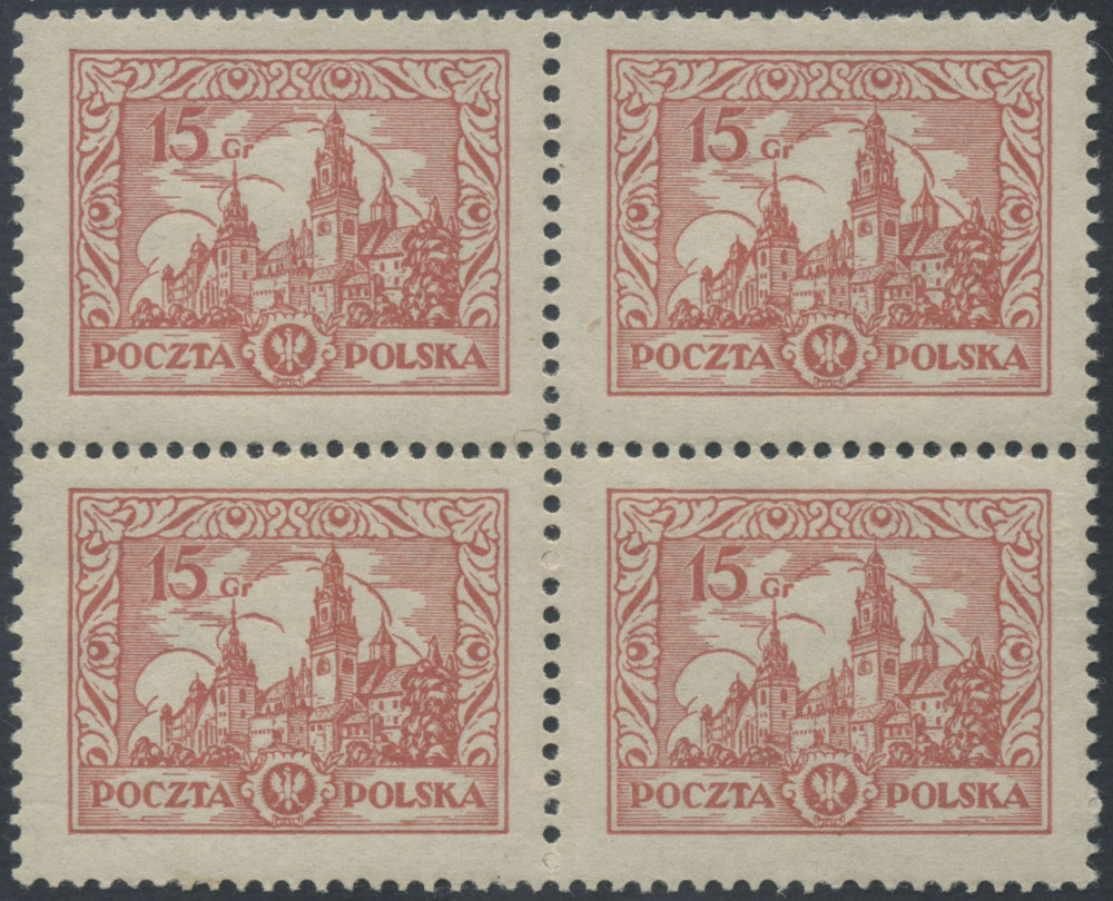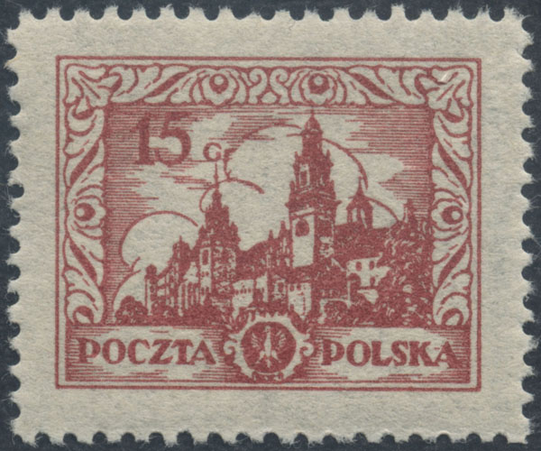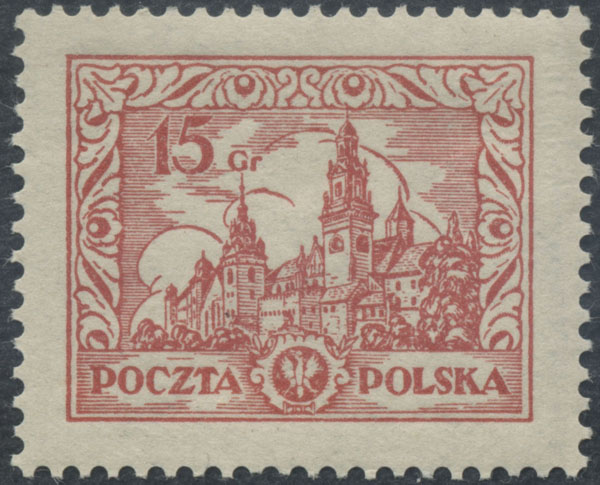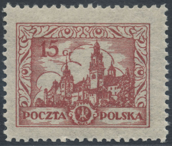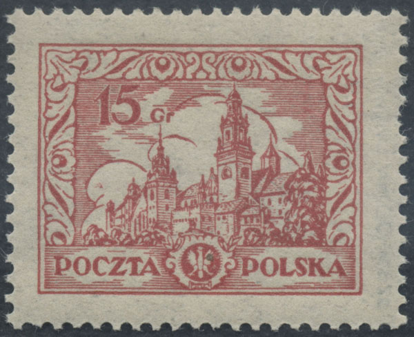 1925 wydanie obiegowe - Wawel, znaczek za 15 gr o rzadkim ząbkowaniu liniowym ZL 11½:11¾ na podlepce (Fi. bez podlepki 150.-), dobry stan zachowania. | Fi.210I ZL Mi.238I |