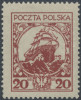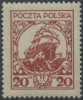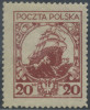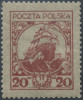 1925 wydanie obiegowe, drugie fałszerstwo na szkodę poczty znaczka za 20 gr. w kolorze różowawoczerwonym o nieostrym rysunku, używane często w Poznaniu, gwarancja i opis Schmutz. | Fi.211 FPII Mi.239 Pfa |