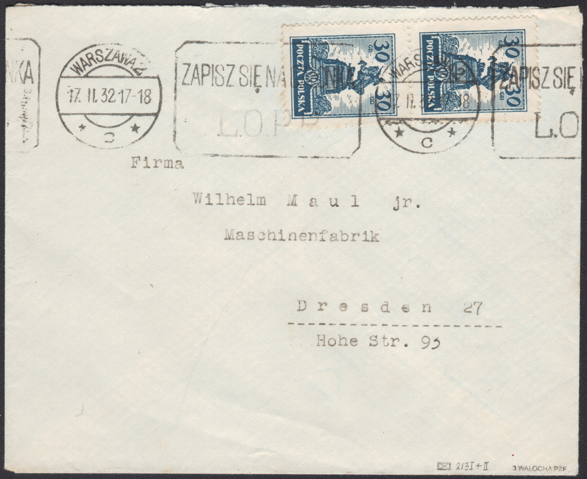 1925 wydanie obiegowe, 30 gr z I rzadkiego nakładu - parka pionowa zawierająca oba typy znaczków I+II na liście wysłanym 17.II.1932 z Warszawy do Drezna, znaczki skasowane okolicznościowym stemplem wirnikowym "ZAPISZ SIĘ NA CZŁONKA L.O.P.P." z wyróżnikiem "*c*" w urzędzie Warszawa 2 (Myślicki 30 102); parki takie są bardzo rzadkie, na liście spotykane wyjątkowo rzadko; walor w doskonałym stanie zachowania; gwarancja i opis Walocha. | Fi.213I+213II Mi.241I |