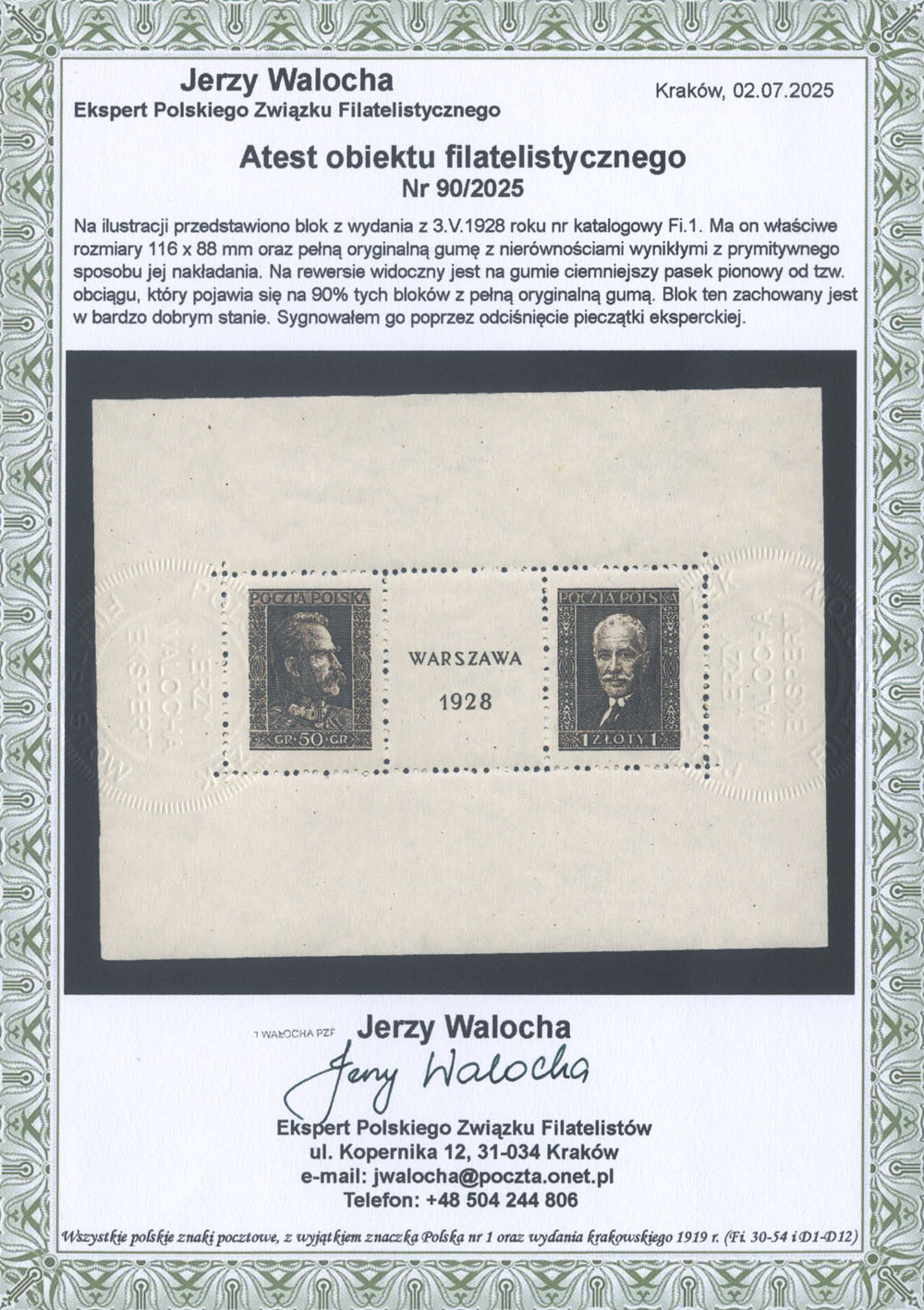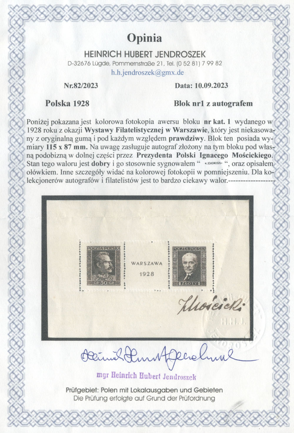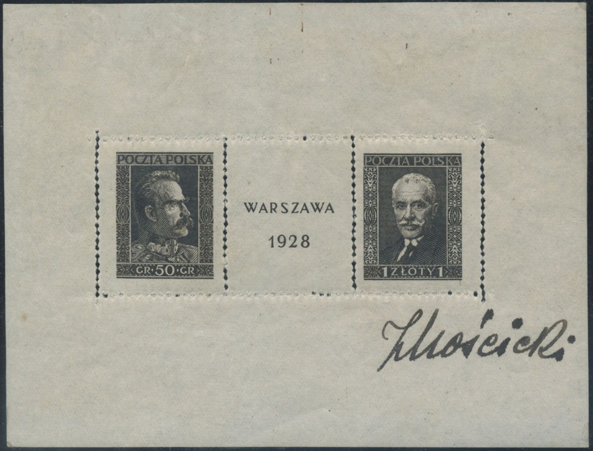 1928 Wystawa Filatelistyczna w Warszawie, blok z podpisem prezydenta Ignacego Mościckiego, duża rzadkość, fotoatest Jendroszek. | Fi.bl.1 Mi.Bl.1 |