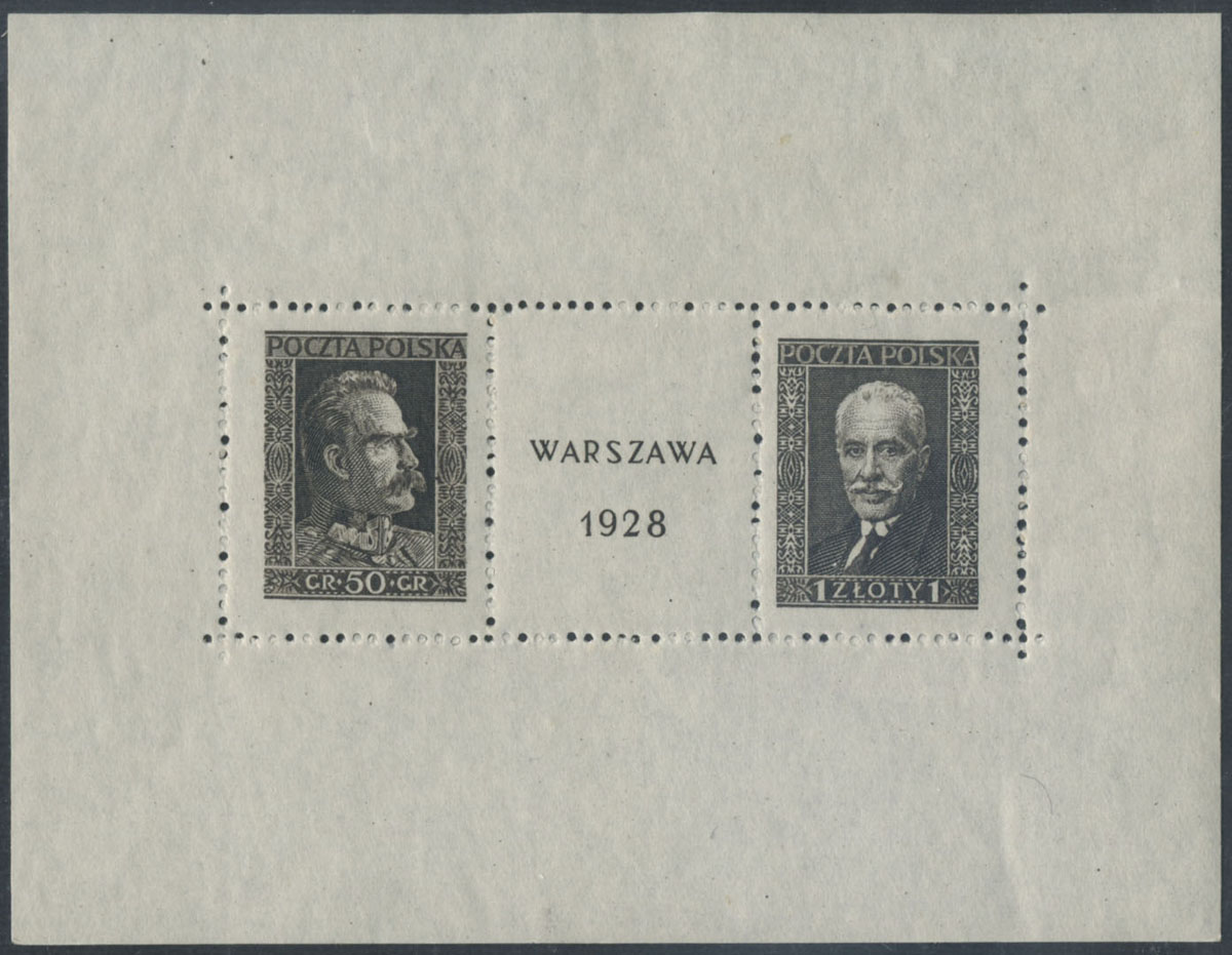 1928 wystawa filatelistyczna w Warszawie, blok z drobnymi zagnieceniami widocznymi na skanie, gwarancja Jendroszek. | Fi.bl.1 Mi.Bl.1 |