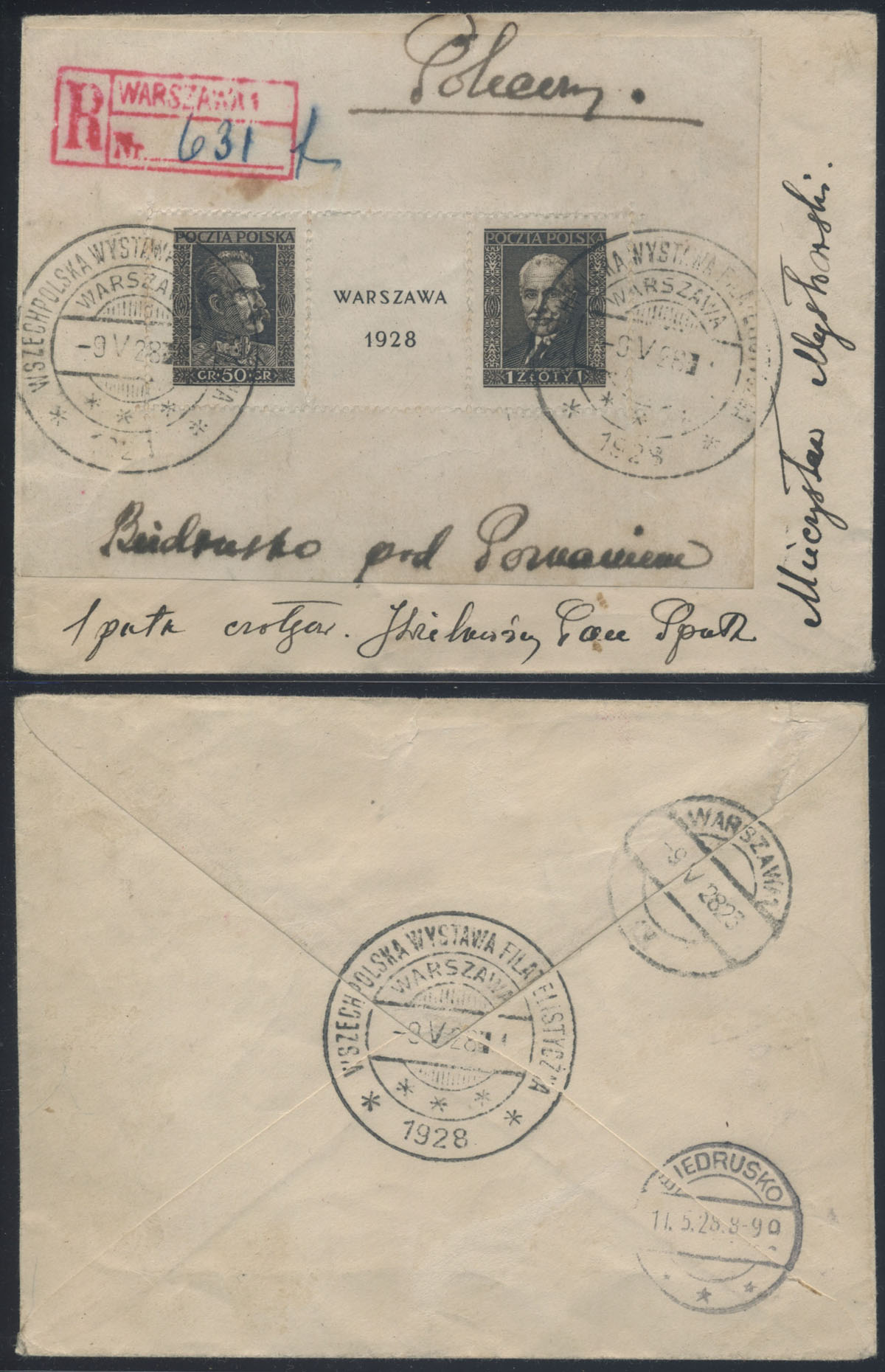 1928 Wystawa Filatelistyczna w Warszawie, blok unieważnionym kasownikiem okolicznościowym Wystawy w Warszawie na liście polecony do Biedruska, na odwrocie stempel odbiorczy. | Fi.bl.1 Mi.Bl.1 |