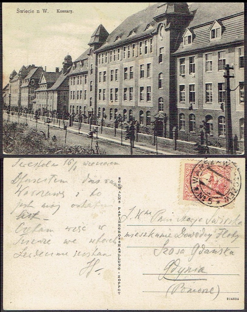 1928 kartka nadana w ambulansie pocztowym nr 5 na trasie Warszawa - Tczew, datownik z wyróżnikiem a, datownik z tego ambulansu jest bardzo rzadko spotykany, na widokówce Świecie n.Wisłą - Koszary. | |