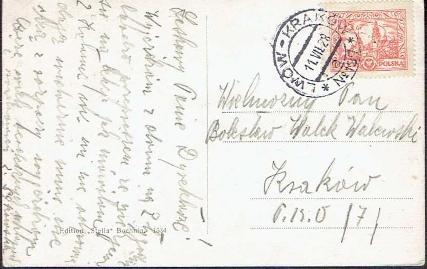 1928 kartka nadana w ambulansie pocztowym nr 137 na trasie Lwów - Kraków, datownik z wyróżnikiem a. | |